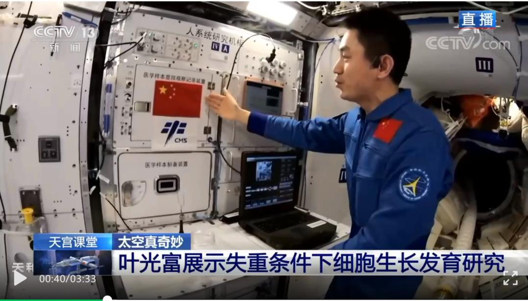 2021年12月9日下午15点40分,中国空间站“天宫课堂”第一课如期开启。在面向全球直播的30分钟课程里,航天员翟志刚、王亚平、叶光富变身“太空教师”,给地球上的孩子们打开了一个个神奇的新视界。这其中,“太空细胞学研究实验展示”项目特别引人注目,当航天员叶光富把手指向舱壁上嵌着五星红旗的一个位置,讲解失重条件下的细胞生长发育研究时,当心肌细胞在荧光显微镜下一闪一闪地跳动时,守在电视机前看直播的永新光学董事长曹其东的心也一起激动起来。因为安装在国旗下的这台太空显微实验仪就是由永新光学制造的中国第一台太空显微镜。