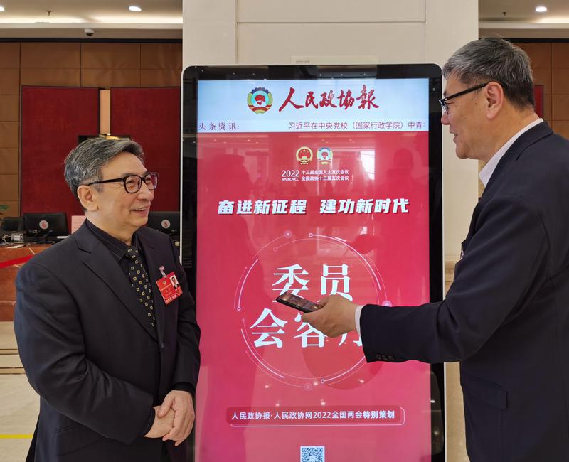 特邀委员记者王众一委员(左)在人民政协报大屏前采访报到后的高洪委员。王众一 供图