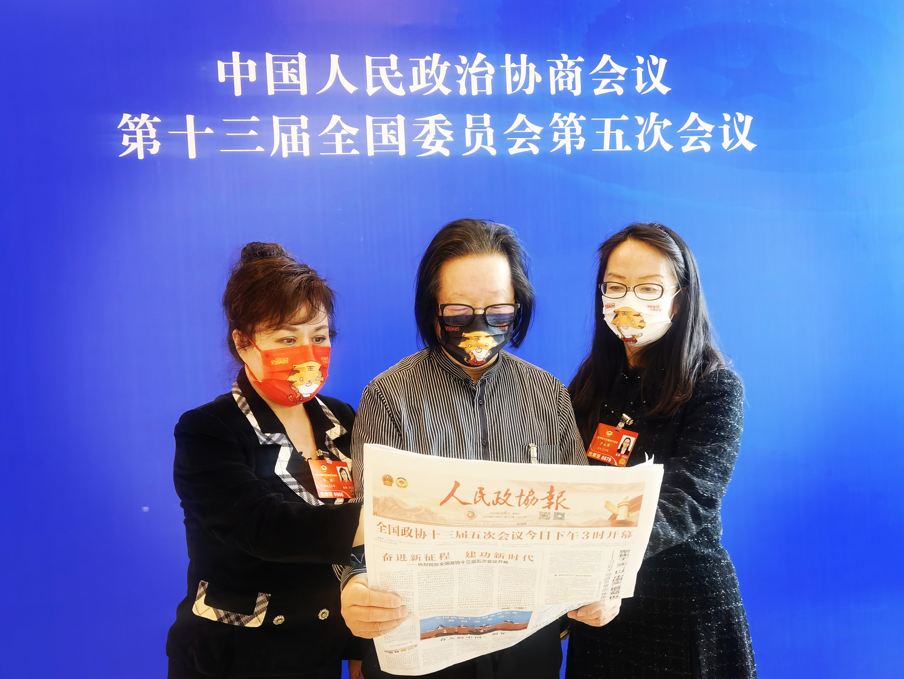 李瑛委员、王建国委员、卢永琇委员(由左至右)研读《人民政协报》,喜迎大会开幕。特约委员记者 刘月宁/摄