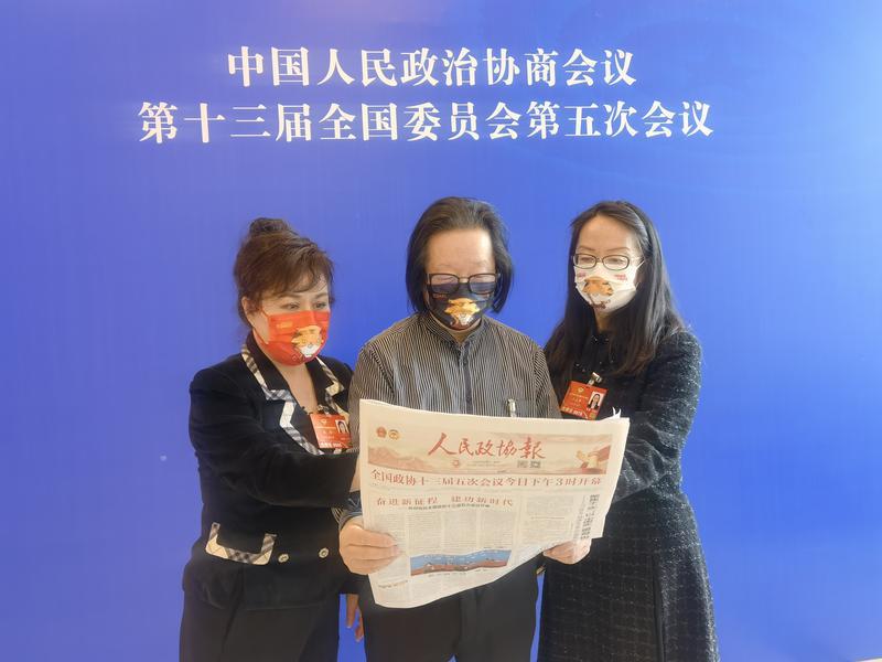 李瑛委员、王建国委员、卢永琇委员(由左至右)研读《人民政协报》,喜迎大会开幕。特邀委员记者 刘月宁 摄