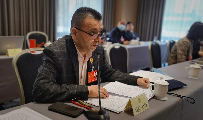 来自新疆的塔吉克族委员玉克塞克?西加艾提作参与“文化润疆”行动的发言。 特邀委员记者 茸芭莘那摄