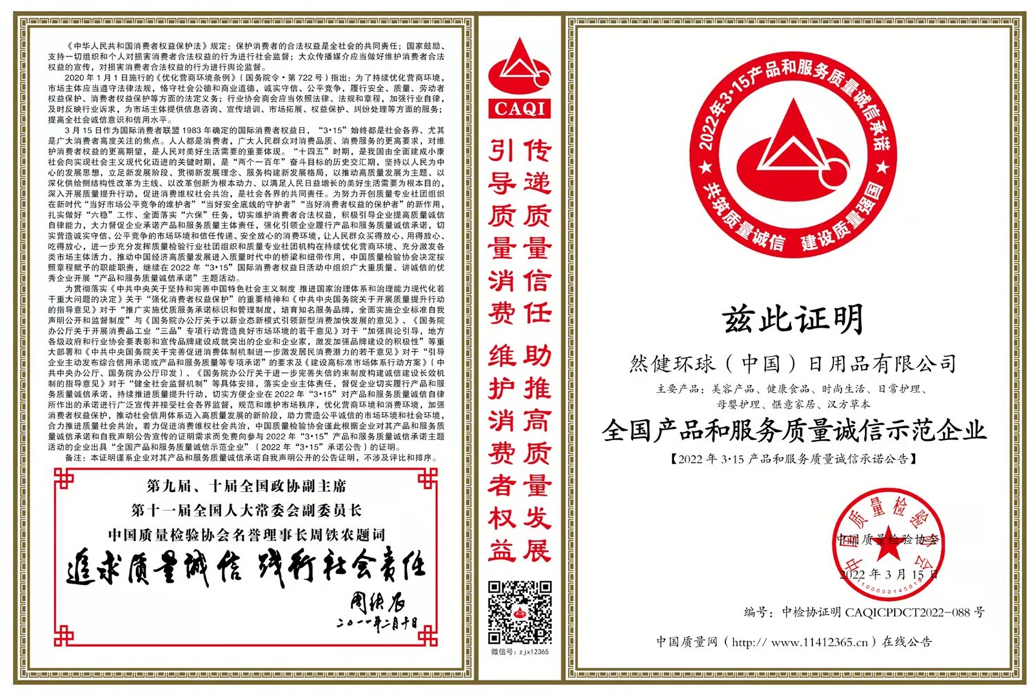 日前,在中国质量检验协会联合千余家优秀企业开展的“3·15产品和服务质量诚信承诺”主题活动中,然健环球(中国)日用品有限公司被授予“全国产品和服务质量诚信示范企业”称号,此前,然健环球中国公司已多次获得此项殊荣。