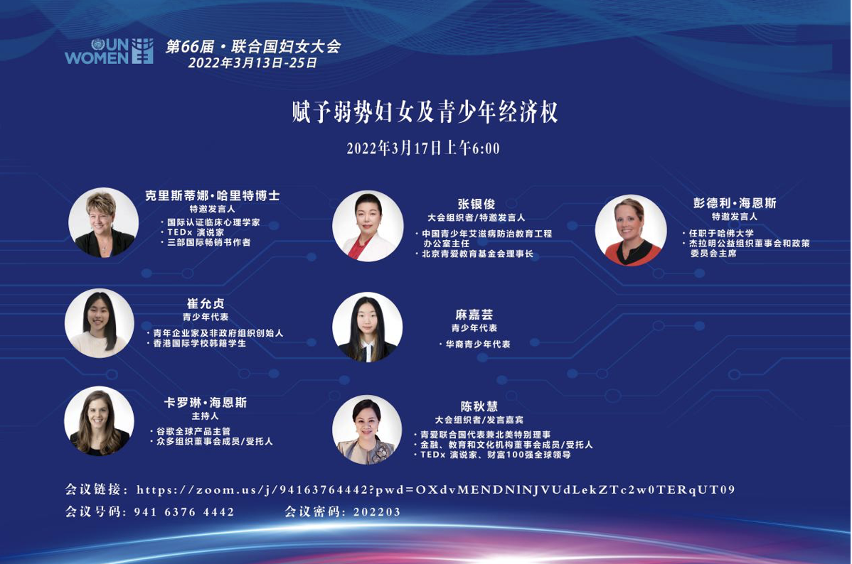 3月14日,联合国妇女地位委员会第66届会议在位于纽约的联合国总部开幕,本届会议主题为“在气候变化、环境与减灾政策和项目方面实现性别平等及妇女和女童赋权”。北京青爱教育基金会申请举办两场边会,进一步丰富拓展了联合国妇女地位委员会第66届会议议题,扩大了会议影响。首场边会就?;じ九扒嗌倌耆ㄒ?,推动实现联合国2030年可持续发展目标进行探讨交流,分享智慧经验。