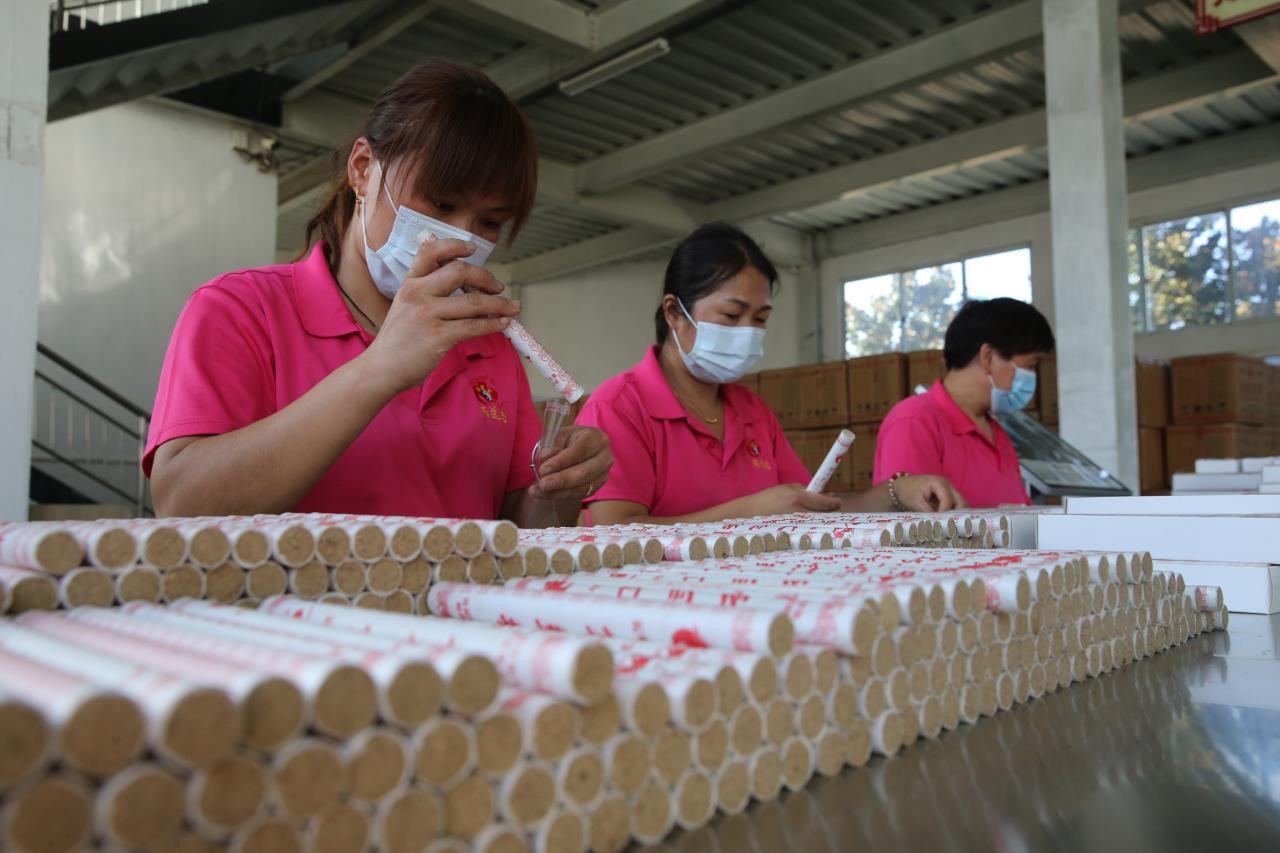 在南阳药益宝艾草制品有限公司的车间内,工人们正熟练地操作着机器,将艾草进行深加工,与此同时,一箱箱艾条、精油、洗护用品等被装进快递箱,等待着快递员上门揽件,发往全国各地。
