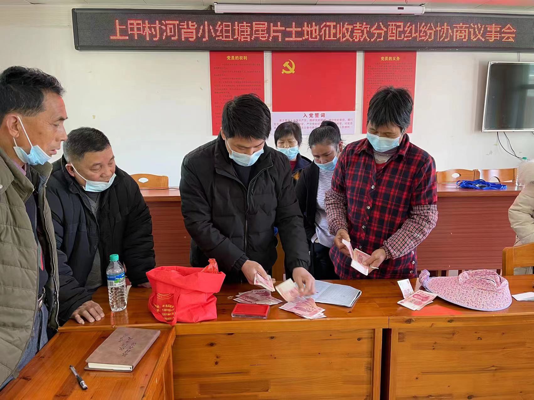 文峰乡上甲村2019年遗留至今土地征收款分配问题,是影响社会稳定的老大难问题。协商议事会主动介入,细化工作措施,浓厚协商氛围,通过委员参与、群众讨论、乡贤劝导、政策解读和利弊分析等方式广泛互动协商, 16户村民代表意见终于达成一致,14万土地征收款在会场向村民发放。
