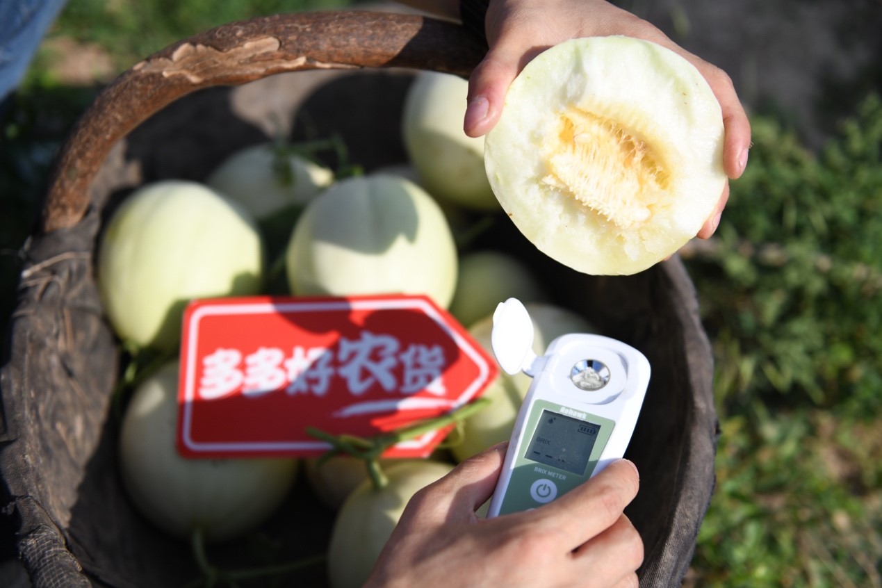 采摘下来的甜瓜测试糖度。摄影 窦翊明