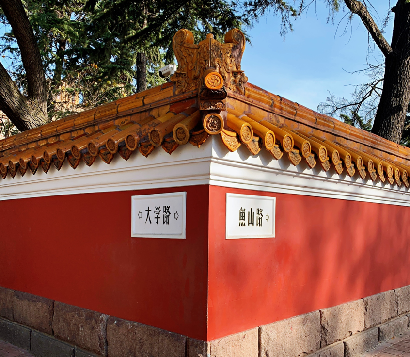 金黄色的琉璃瓦,朱红色的墙壁,白玉路牌上一个标有大学路,一个标有鱼山路,在蓝天白云的映衬下别具一番风味……这是青岛美术馆的外墙拐角处的景色,也是青岛第一“网红打卡地”,每天吸引着无数游客在此合影留念。然而,相对于墙外的热度,院落里中西合璧、不拘传统的建筑群和精心策划的展览反倒相对“冷落”。