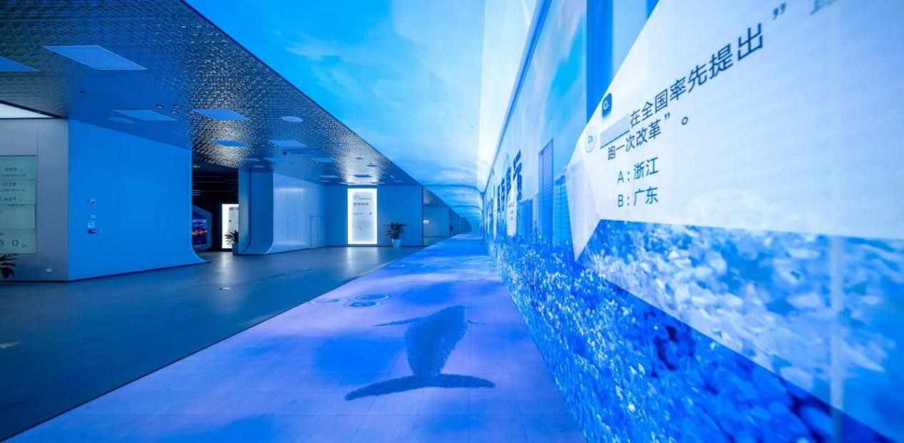 台州“城市大脑”运营中心(数字馆)主要包含展示体验区、运营指挥大厅、运营工作室、科技工作者之家和建筑外立面投影几个区域,合计约4800平方米。其中,展示区建设面积合约3100平米。其中的展示体验区围绕“城市大脑”建设和数字化改革中涌现的优秀场景应用,依托一体化智能化公共数据平台,按照标准化、模块化、屏幕化和投射化原则建设,营造了具有强烈感染力的现代展示环境。接入多个直面社会热点、解决民生关切的特色场景应用,构建出与民众息息相关的城市美好生活的数字化界面,切实让市民感受到数字治理城市带来的改革红利。