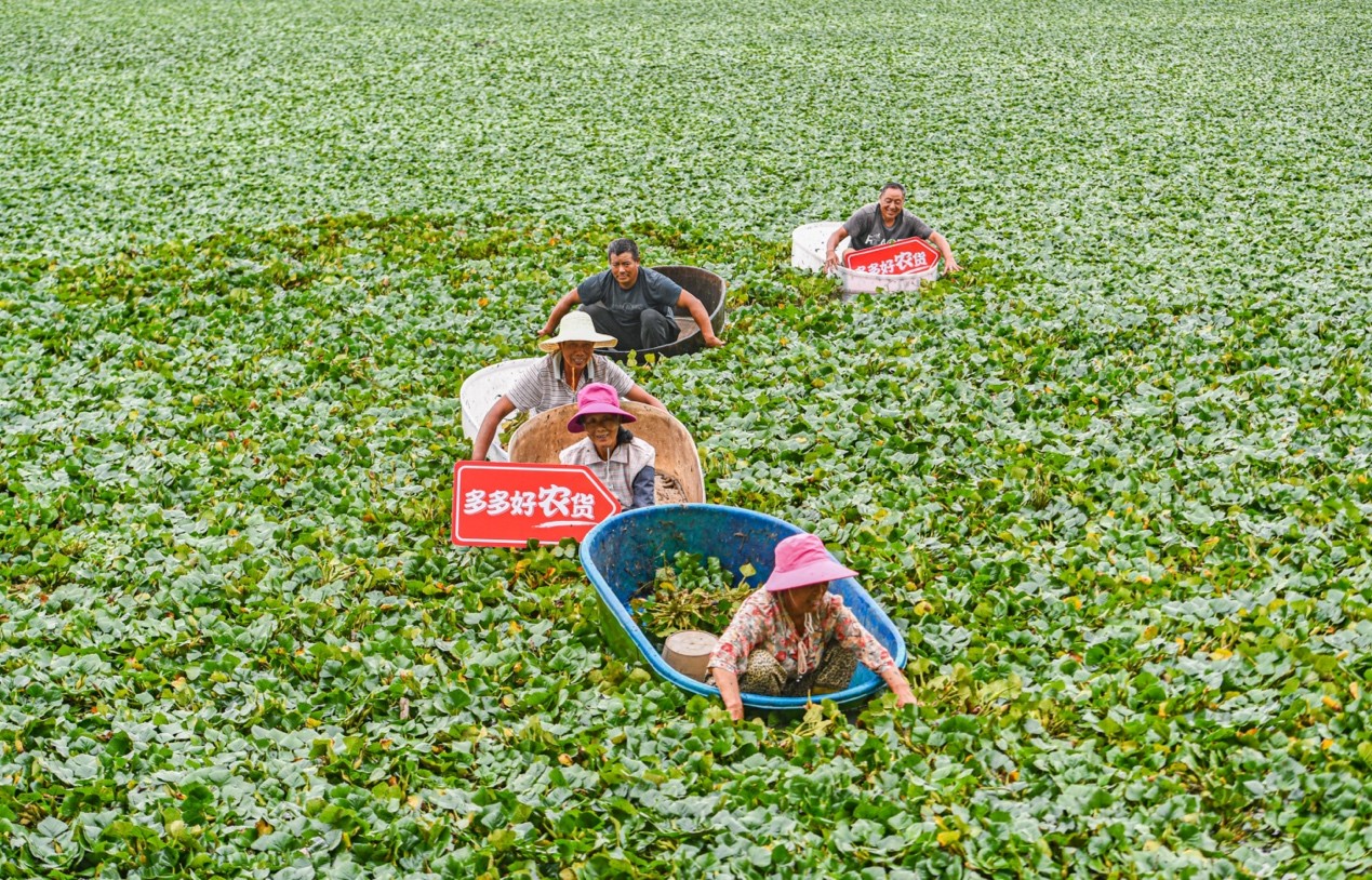 菱角塘内,大片绿油油的菱角叶漂浮在水面,随处可见菱农们忙碌的身影。