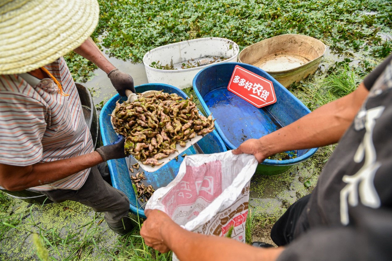 采购量稳定后,很多以前养鱼、养虾、种田的农民们,也选择了种菱角?;褂懈诚性诩业拇迕?,靠着采菱手艺做起了“兼职”,一个熟手一天能采一百多斤菱角,整个收获季,能赚上三四万元,顺利实现了增收。