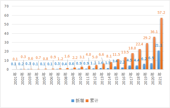 截至2021年底,全球海上风电累计装机容量为57.2吉瓦,同比增长近60%,占全球总装机的比重为22.5%,其中中国占48%,英国占22%,德国占13%。从新增装机容量看,2021年呈爆发式增长,新增装机容量21.1吉瓦,其中中国占80%,英国占11%,越南占4%。(见图1)