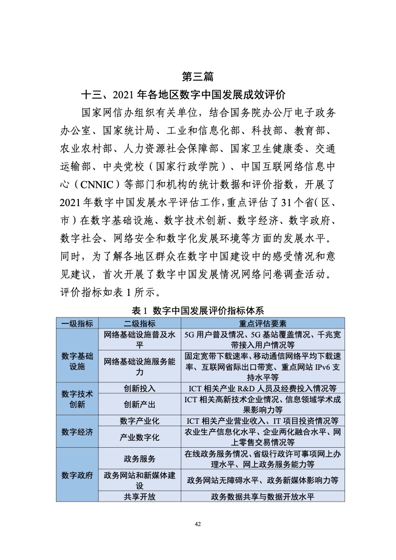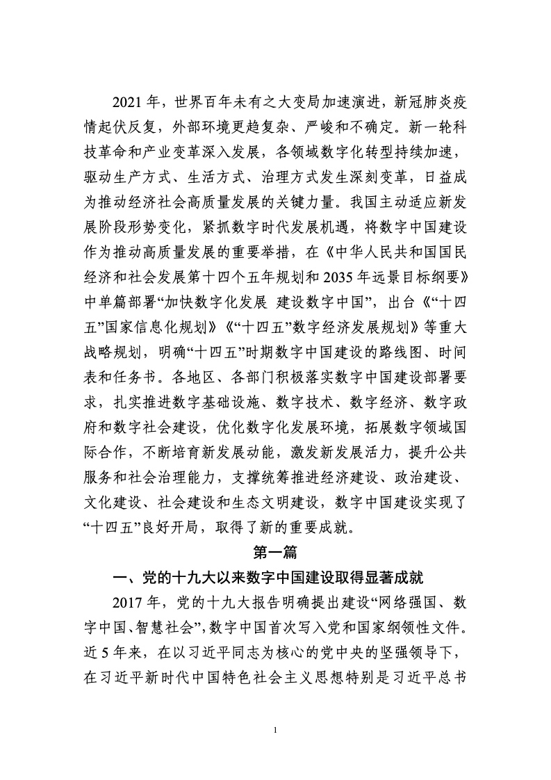 为贯彻落实党中央、国务院关于建设数字中国的重要部署,深入实施《国家信息化发展战略纲要》《“十四五”国家信息化规划》等战略规划,国家互联网信息办公室会同有关方面跟踪监测各地区、各部门数字化发展情况,开展数字中国发展水平评估工作,编制完成《数字中国发展报告(2021年)》(以下简称《报告》)?!侗ǜ妗纷芙崃说车氖糯笠岳词种泄ㄉ枞〉玫南灾删秃?021年的重要进展成效,评估了2021年各地区数字化发展水平,并对2022年数字中国建设进行了展望。