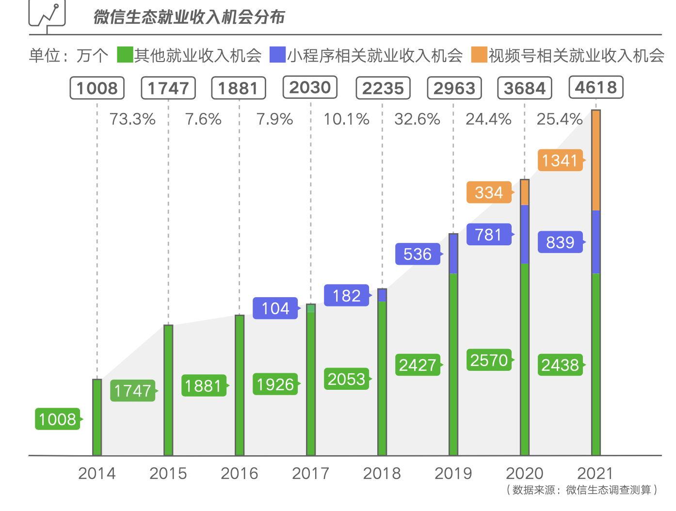 随着移动互联网日益普及,人工智能、大数据、云计算等技术快速发展,加快了企业数字化转型步伐,数字生态催生了大批新职业、新岗位,数字化就业快速崛起?!侗ǜ妗废允?,以微信公众号、小程序、视频号、微信支付、企业微信等共同构成的微信数字生态,在2021年衍生的就业收入机会达到4618万个,同比增长25.4%,增长主要是由于视频号等新业务的带动。