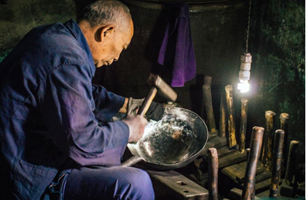 历经十二道工序,十八遍火候,在一千度左右的高温锤炼,经受上万次锻打,方得一口好的章丘铁锅。(摄影 王雅洁)