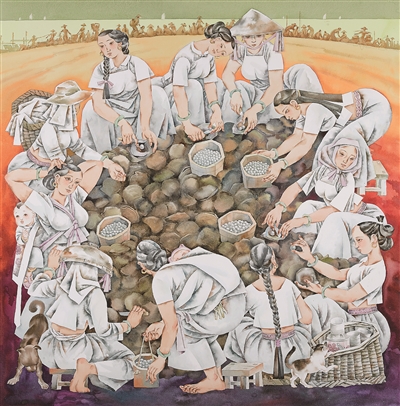 蓝天之下祈丰年,丰收归来鱼满仓,鳞次栉比的渔家小楼见证人民的幸福生活,展翅高飞的海鸥寓意对新时代新生活的向往和憧憬……这些别具北部湾海丝路风情的景象,被浓缩在一张张大大小小的画框中,呈现在慕名而来的全国观众眼前,上演了一场跨越古今、纵贯南北的精彩艺术对话。