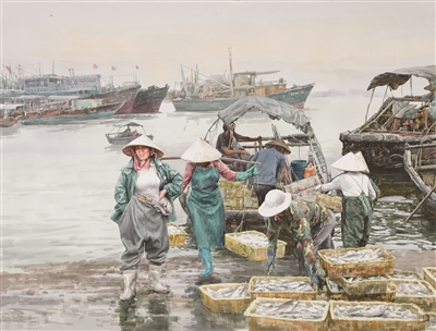 两千多年前,中国的船队从合浦出发,沿着中南半岛和印度洋沿岸的东南亚各国及南亚国家,直达波斯湾,开启了影响深远的海上丝绸之路,孕育出辉煌璀璨的海丝文明。如今,广西主动融入“21世纪海上丝绸之路”建设,开放发展大潮涌动,北部湾建设风生水起。步入展厅,冼小前的《海鸥》、张国楠的《归来鱼满仓》、张国权的《疍家珠女(组画)》、雷务武的《红土欢歌》、王可大的《渔歌》、黄超成的《有客人来》、包建群的《夕照老街》、肖畅恒的《北部湾之春》、黄华兆的《盛世海丝》、刘成的《海丝路古城之合浦》等优秀作品依次映入眼帘。广西水彩画艺术家以环北部湾地区古代海上丝绸之路的人文风情为主要创作符号,寻找海上丝绸之路的共同文化价值,创作出一幅幅精品力作,用笔墨和色彩展现了广西北部湾地域的历史文化、人文情怀、建设成就,将“海丝路文化”所具有的美感特征发挥得淋漓畅快,抒发了对祖国的热爱,对家乡的赞美,对时代的歌颂,充分彰显了广西水彩的新视角与新气象。