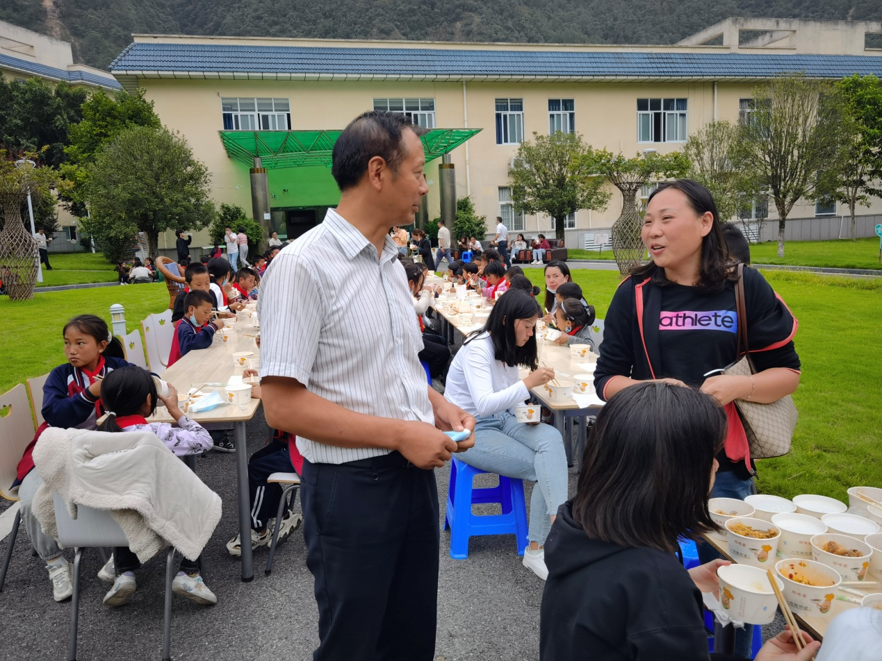 市政协主席戴华强在大岗山营地了解学生用餐情况。(雅安市政协供图)