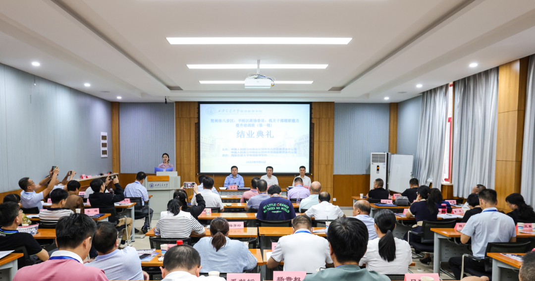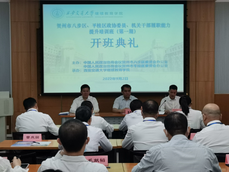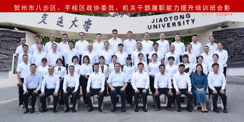 人民政协网贺州9月12日电(记者 付振强 通讯员 叶欢敬 彭敬添)9月1日至7日,广西贺州平桂区、八步区政协委员、机关干部履职能力提升培训班(第一期)在陕西省西安交通大学如期举行。这也是平桂区和八步区两个区首次联合举办培训,展现出了新时代市县政协在培训和交流互动上的新样子。广西贺州平桂区政协主席吴航、广西贺州八步区政协主席邹贵惕出席开班仪式、结业仪式并全程参加了培训。