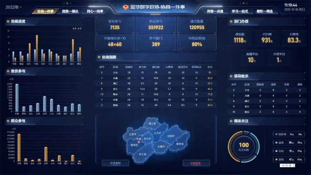 今年以来,金华市政协借省市数字化改革契机,以全流程全方位全系统全媒体的“四全”为理念,以实现跨层级跨地域跨系统跨部门跨业务的“五跨”高效协同为突破,聚焦“请你来协商”品牌建设,集成开发“协商一件事”应用,从议题征集、调查研究、组织协商、跟踪落实、评价转化等关键环节入手,系统性推动方式优化提升、流程优化再造、机制优化重塑,赋能助力协商参与广度拓展、协商议政扩面提质、协商民主量化闭环,有效提升了政协协商民主的开放度活跃度融合度。
