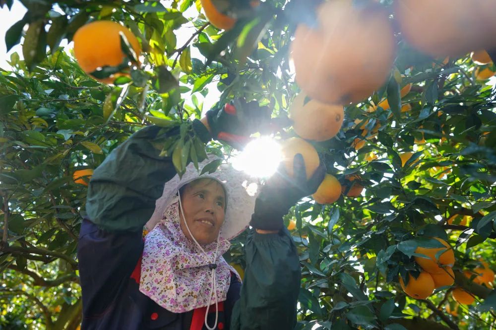 △在江西省赣州市章贡区沙石镇下茹村,果农在采摘脐橙。新华社记者 周密 摄