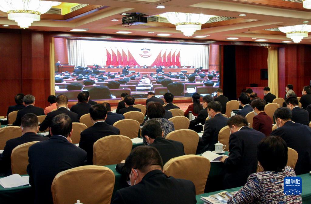 3月9日,全国政协十四届一次会议举行视频会议,委员作大会发言。这是主会场。新华社记者 丁海涛 摄