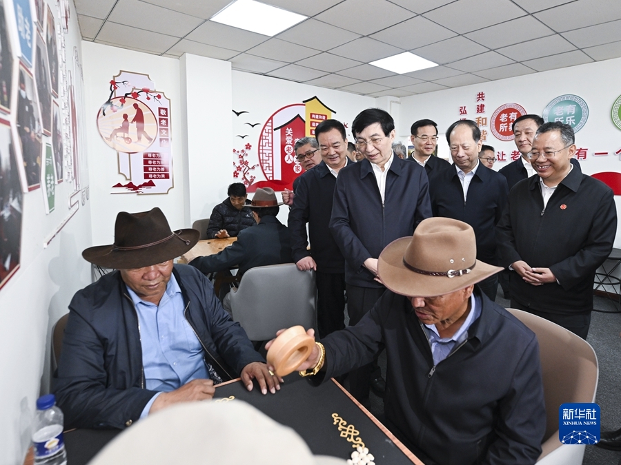 7月25日至27日,中共中央政治局常委、全国政协主席王沪宁在西藏调研。这是7月25日,王沪宁在林芝米林市西嘎门巴村走访看望群众。新华社记者 燕雁 摄