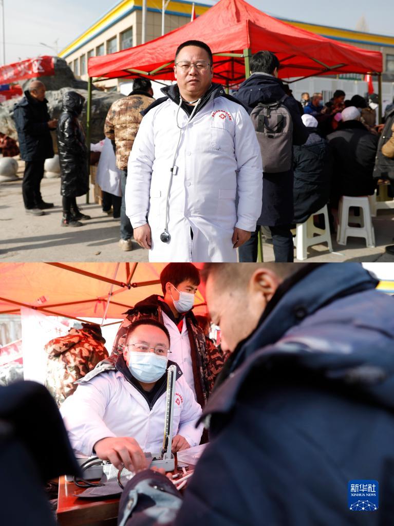 拼版照片:上图为39岁的积石山县中西医结合医院医生陶希明在受灾群众临时安置点的医疗救治处(12月21日摄)。震后,陶希明参与地震伤员转移和救治工作。21日,他来到积石山县大河家镇大河村安置点,为受灾群众接诊及配发药物;下图为12月21日,陶希明(右三)在为受灾群众量血压。