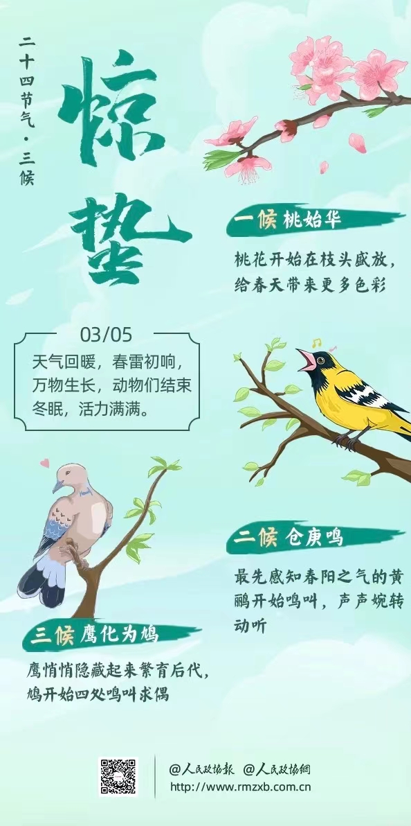 “微雨众卉新,一雷惊蛰始。田家几日闲,耕种从此起?!苯袢眨颐怯炊慕谄械牡谌鼋谄?。惊蛰有三候:一候,桃始华;二候,仓庚鸣;三候,鹰化为鸠。春雷响,万物长,从此天气回暖,春雷始鸣,世间万物在惊蛰声中缓缓醒来。