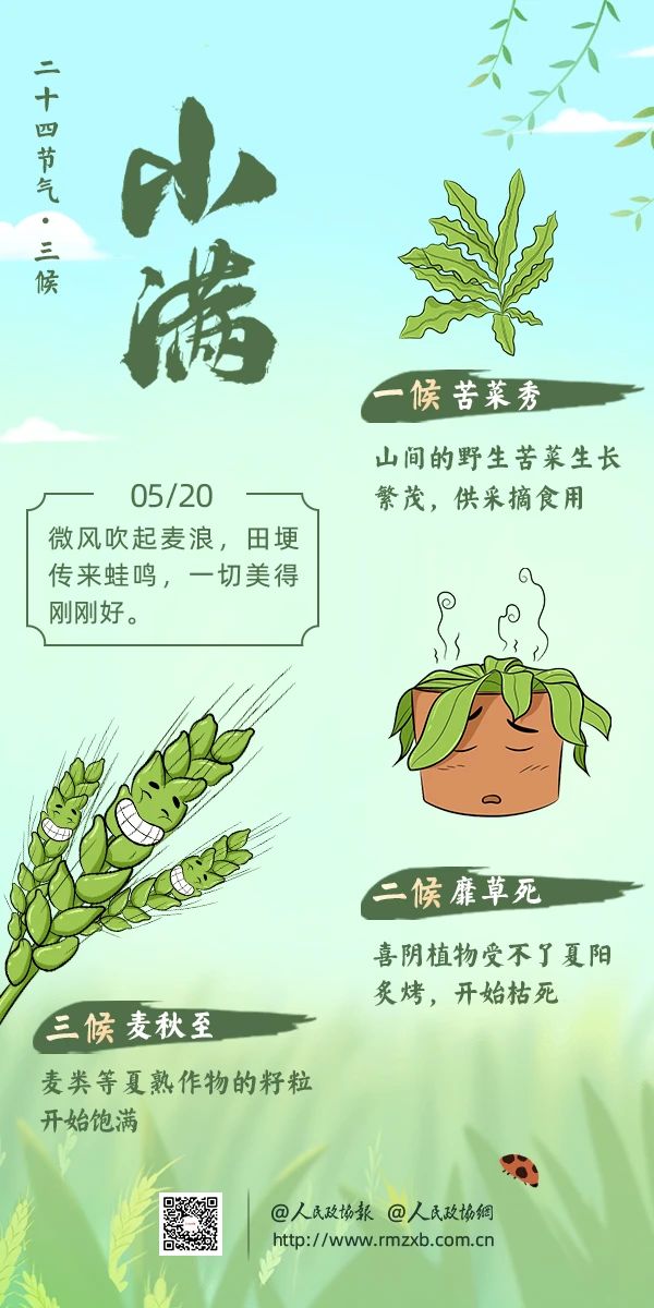 今日,我们迎来小满节气。“小满者,物致于此小得盈满?!闭飧鍪苯冢÷笳倒嘟?,麦??雌鹄春孟癖ヂ?,其实还只灌了个“半饱”,并未成熟,故称“小满”?!靶÷÷咏ヂ?。南方雨水充盈,江河湖塘水量渐渐丰沛,桑叶正肥,新蝉鸣叫,樱桃转红,青杏渐黄,盛夏的特征日渐清晰。
