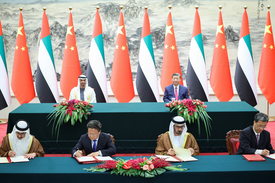 5月30日下午,国家主席习近平在北京人民大会堂同来华国事访问并出席中国-阿拉伯国家合作论坛第十届部长级会议开幕式的阿联酋总统穆罕默德举行会谈。这是会谈后,两国元首共同见证签署多项双边合作文件。新华社记者 刘彬 摄