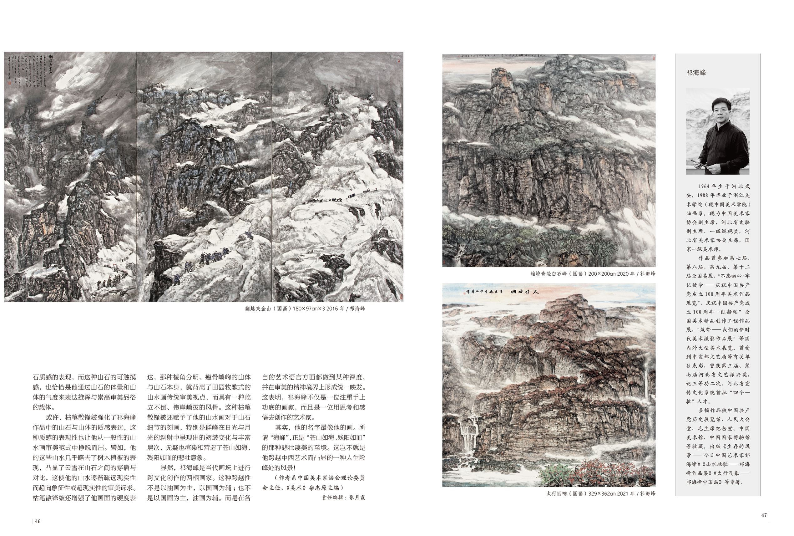 祁海峰的这种从油画到中国画、从中国画到油画的创作推演与互动,让他的创作观念与创作方式获得了双重的审美镜像。也就是说,他在审美追求上试图从现实中提升某种雄浑崇高的审美精神,而在艺术语言上却因这种精神的呈现而修正与创造了新的语言范式。就中国画自身的审美体系看,他的山水画无疑具有中国画的传统文化精神与笔墨观照自然的独特表达方式。在借鉴传统方面,他的山石皴法以干笔勾皴为主,将斧劈与散锋结合在一起;在吸纳现代方面,则是把抽象水墨自然渗化的意趣作为流云变灭的空间予以表现。这些传统与现代的笔墨语言的运用,既赋予了他的山水画以笔墨的境界,也为他的山水画增添了文化的厚度。尤其是他从传统中整合出的枯笔散锋皴,强化了山石质感的表现,而这种山石的可触摸感,也恰恰是他通过山石的体量和山体的气度来表达雄浑与崇高审美品格的载体。