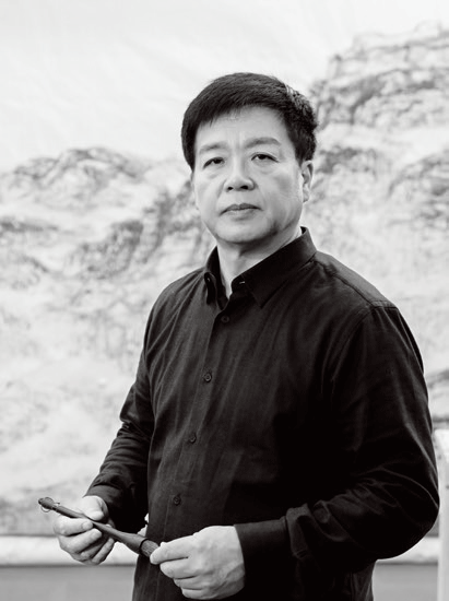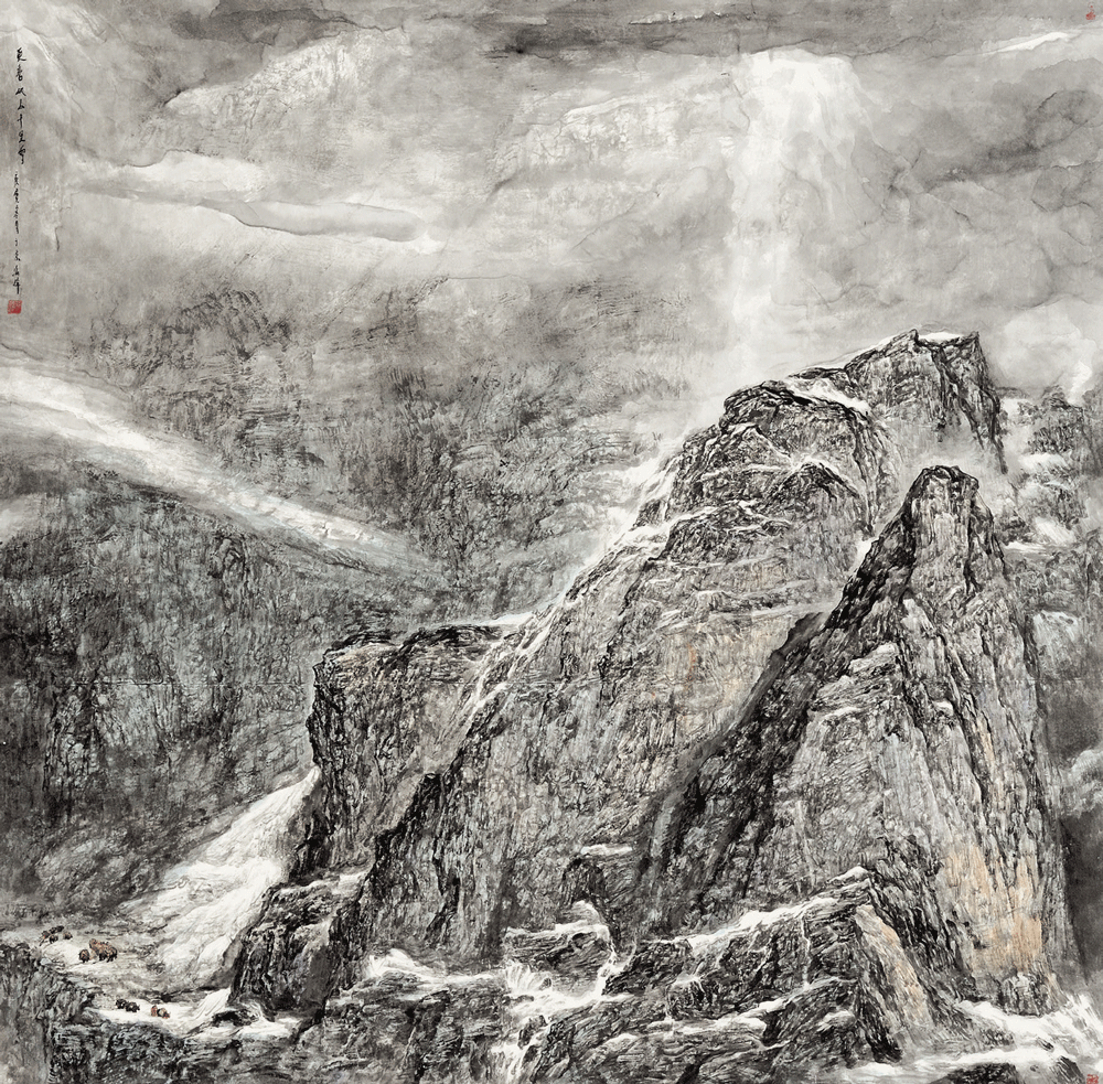作为中国画家的祁海峰,也让人们看到了他不俗的立意和对于中国画笔墨的感悟。他的山水画气象宏伟,境界深沉,并非一般意义上的山川草木之情,而是让人感受到一种历史与现实的寄寓和象征。那么,这种山水画是否也和他的油画形成了某种同构的关系呢?或许,他的油画《惊恐的羊群》和中国画《太行启明》,已揭示了他的油画与中国画在语言上的异趣和精神审美品格上的同一?!毒值难蛉骸分兴浦泄剿壅辗椒ǖ淖匀换肪趁栊?,表明了祁海峰在传统中国画方面的深厚素养;而他在油画上追求的这种悲剧性与崇高感,也在《太行启明》这幅中国画作品里获得了一种新的转换。作品通过超现实时空表达的,无疑是浴血献身的英魂在雄伟的太行山获得更生的意象。这种具有象征性与表现性的主题山水画创作,几乎构成了祁海峰所有山水画表现的审美基调。也即他的山水画是局部的实写与整体意象的统一,而这种实写虽然具有传统的笔意墨蕴,却具有山石坚硬的质感表达;这种意象虽然具有中国山水画的观照特征,但呈现的境界并非灵动秀丽、恬淡幽深,而是在苦涩凝重之中生发出一种刚健峭拔、雄浑崇高的审美品格。