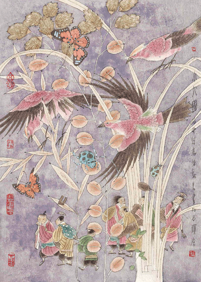 《山海经》在长期的传播过程中,图文并茂是其一大特点,有些部分“图画似乎还占着主要的地位”(见袁珂《中国古代神话》),所以《山海经》又称《山海图》。虽然史有记载,但我们现在所能见到的《山海经》图像,大多创作于明清。朱新昌以100幅如魔如幻的工笔画,对《山海经》中形形色色、奇幻别样的山川方国、人物鸟兽、神话传说、寓言故事做了别开生面的视觉呈现和读解,赋予古老的《山海经》以崭新的艺术生命力。