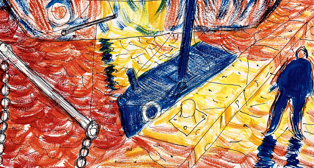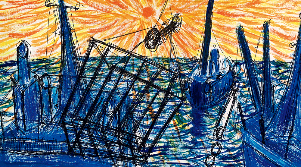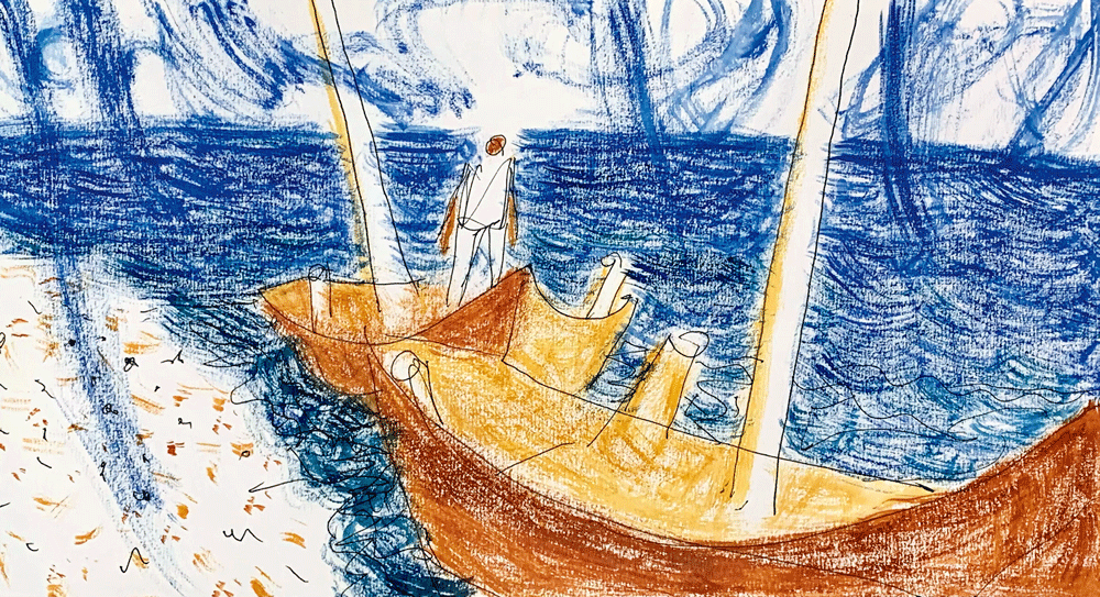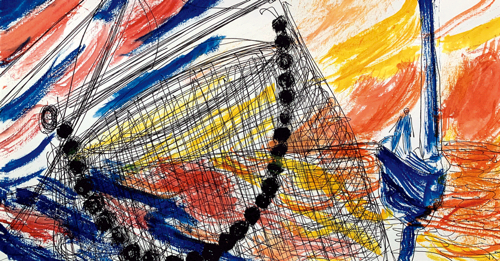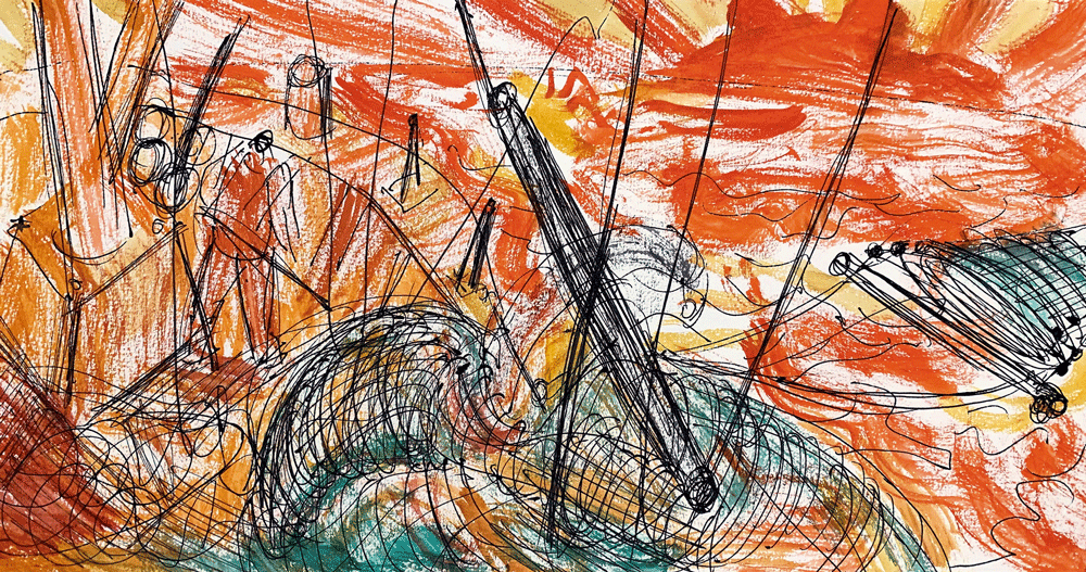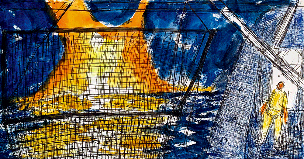 《海上》这批画是孙老师用水彩和签字笔产生出来的新的绘画语言。巨大的轮船、人物胖大的身躯、坚实的巨型铁锚,布满在20×36厘米的小画中一点不违和。高耸的桅杆,飞卷的海浪,炙热的太阳,斑斓的霞光,彰显着画家生命力的昂扬和才华的飞溢,呈现了一个行者艰难的探索和极深的体悟。