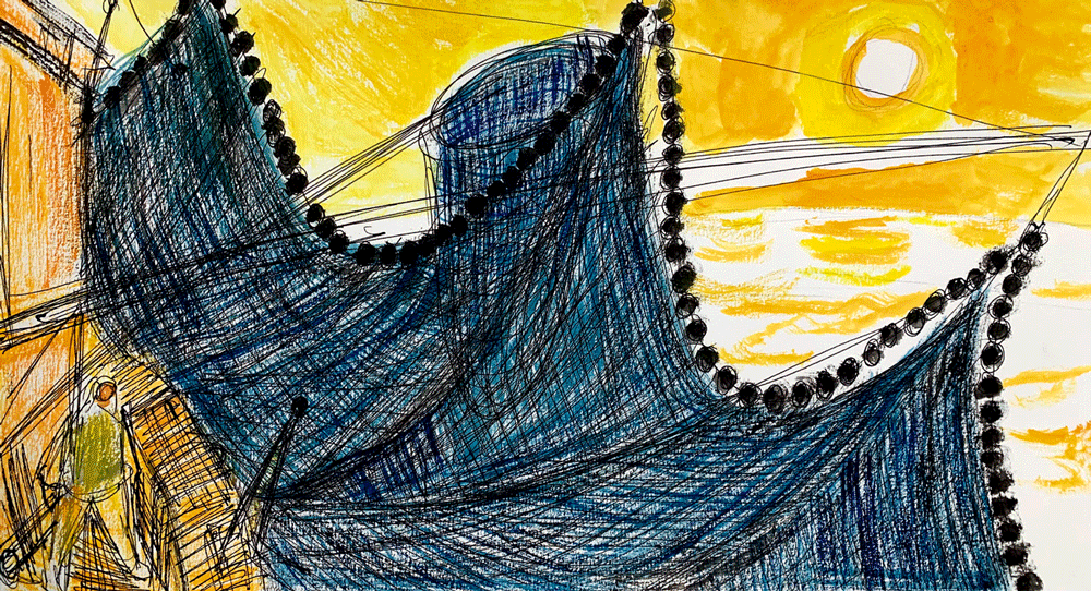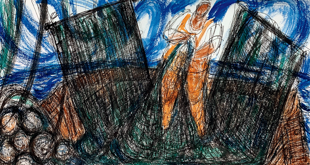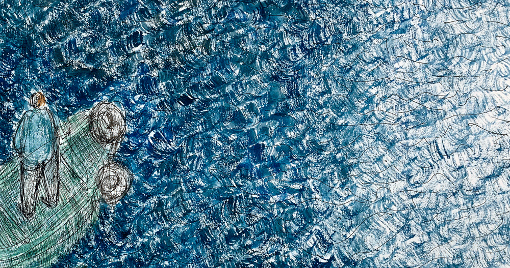 孙静远:签字笔的特征是它会强调骨架,它会强调结构,这是它的特性。水彩的特性就是柔和、充满水滴淋漓的状态。任何一种材料的优点,实际上同时也是它的短板。我为什么要把这两种材料捏合在一起呢,就是想用水彩的柔和弱化签字笔线条带来的刚硬。反过来,签字笔的刚硬也给水彩增加了视觉上的力度,最后呈现出来和传统完全不同的效果。这样就变成1+1>2。人物也好,海浪也好,船也好,实际上就是有限的元素。这批作品数量庞大,大概近千张,我要不停地去改变,我每时每刻都要改变。