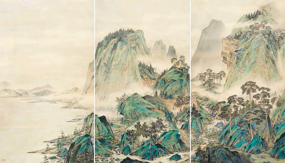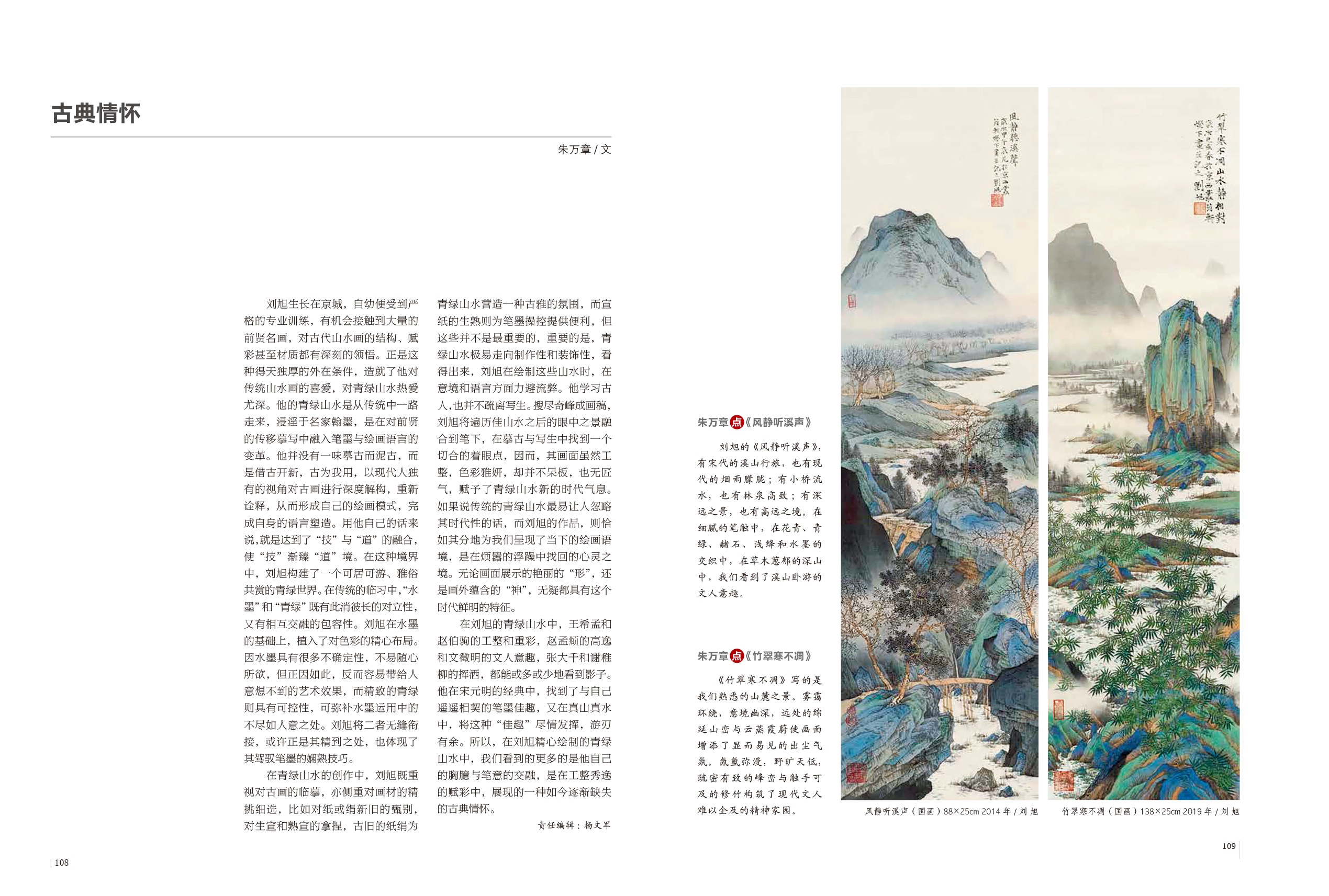 在刘旭的青绿山水中,王希孟和赵伯驹的工整和重彩,赵孟的高逸和文徵明的文人意趣,张大千和谢稚柳的挥洒,都能或多或少地看到影子。他在宋元明的经典中,找到了与自己遥遥相契的笔墨佳趣,又在真山真水中,将这种“佳趣”尽情发挥,游刃有余。所以,在刘旭精心绘制的青绿山水中,我们看到的更多的是他自己的胸臆与笔意的交融,是在工整秀逸的赋彩中,展现的一种如今逐渐缺失的古典情怀。