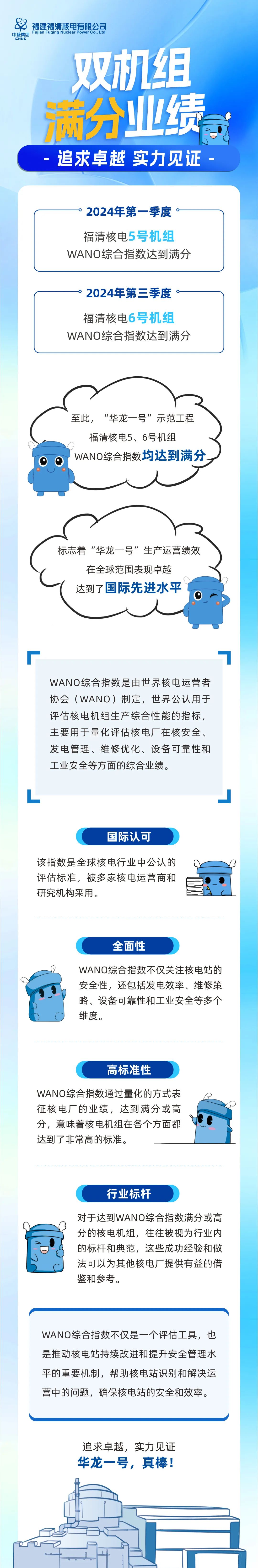 在庆祝中华人民共和国成立75周年之际,依据WANO(世界核电运营者协会)评价规则,中国核电旗下福清核电6号机组综合指数于2024年9月实现满分。至此,“华龙一号”示范工程福清核电5、6号机组WANO综合指数均达到满分,标志着“华龙一号”生产运营绩效在全球范围表现卓越,达到了国际先进水平。