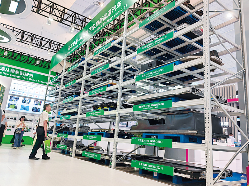 在2023世界动力电池大会上,一家企业展示回收的新能源汽车动力电池(2023年6月9日摄) 胡旭摄