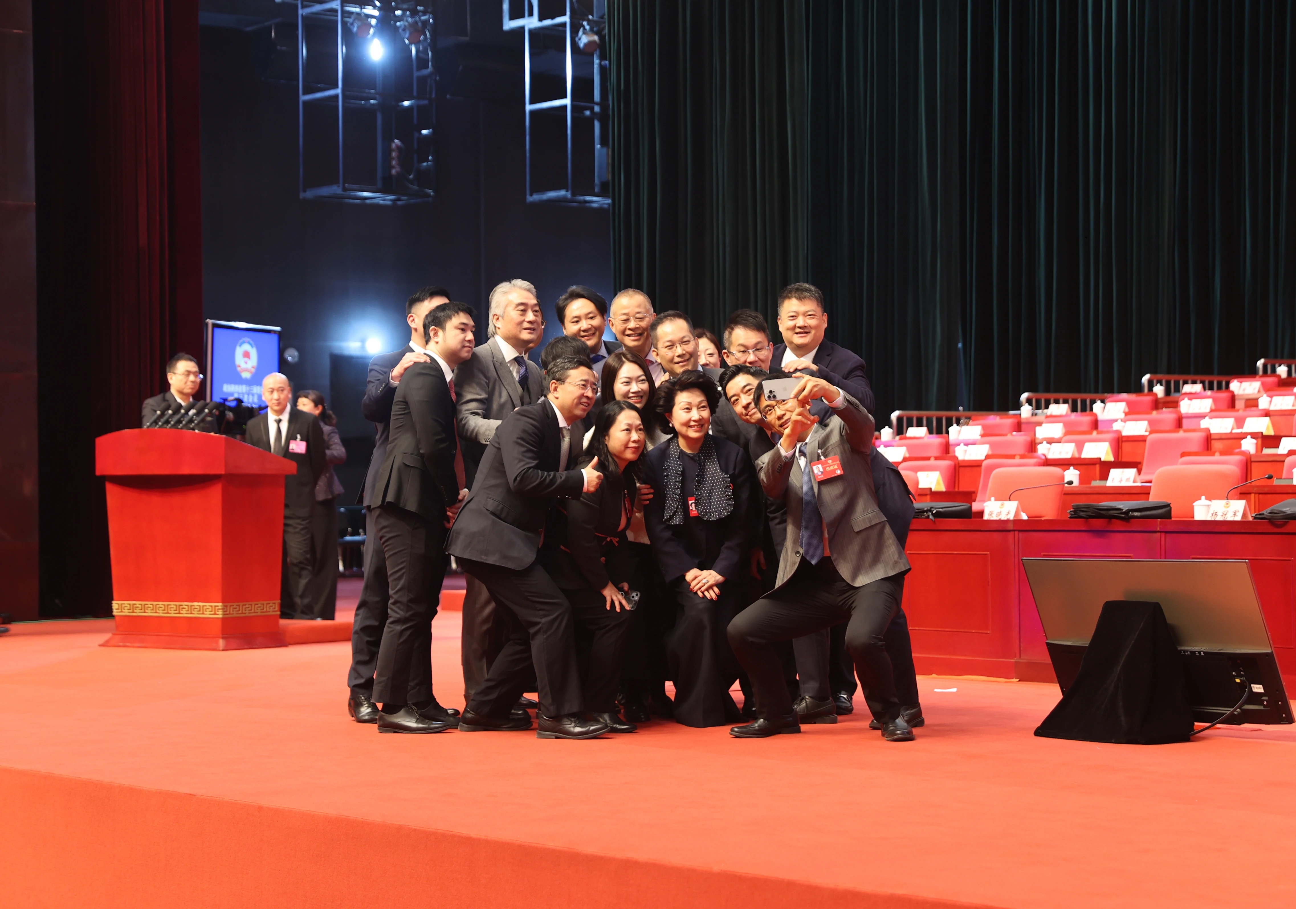 “来,我们一起合个影!”“平时大家各自忙碌,很难聚在一起,刚好趁着省两会召开的时机,把这么美好团结的画面用镜头记录下来?!?月15日上午,在陕西省政协十三届三次会议开幕会后,10余位港澳省政协委员在主席台上集合,用手机记录下这温暖的履职时刻。(路强 张璐 摄影报道)