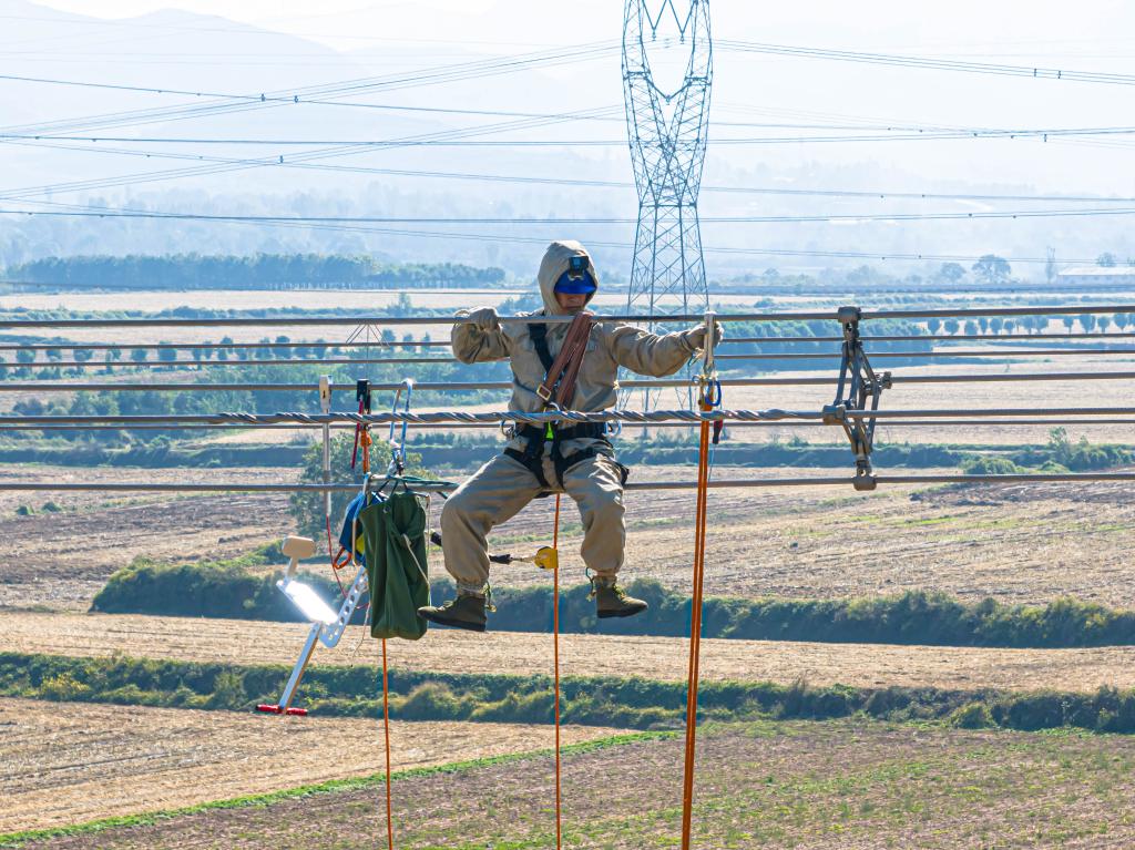 2023年11月12日,国网洛阳供电公司输电带电作业班副班长管霄在进行等电位带电作业,消除220千伏输电线路发热隐患。新华社发(张果峰 摄)