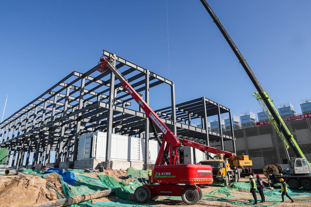 1月6日,中国移动(甘肃庆阳)数据中心施工现场,工人进行钢梁组装作业。新华社记者 郎兵兵 摄
