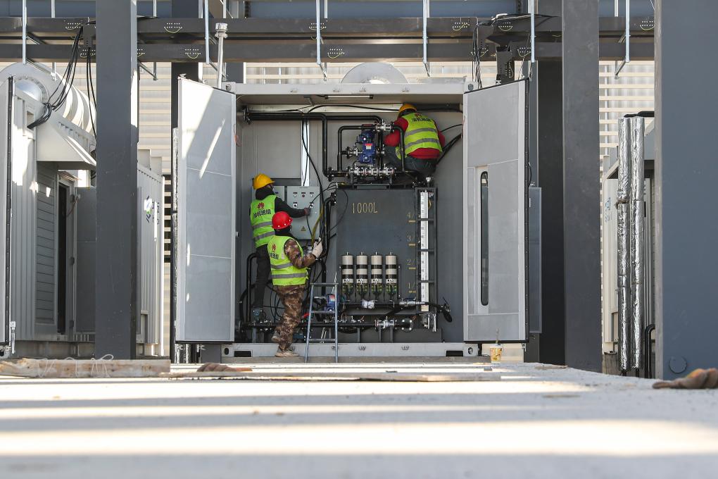 1月6日,中国移动(甘肃庆阳)数据中心施工现场,工人进行油机安装调试作业。新华社记者 郎兵兵 摄