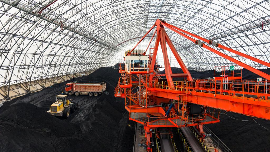 1月3日,工作人员在华能正宁电厂储煤场内堆存燃煤(无人机照片)。新华社记者 郎兵兵 摄