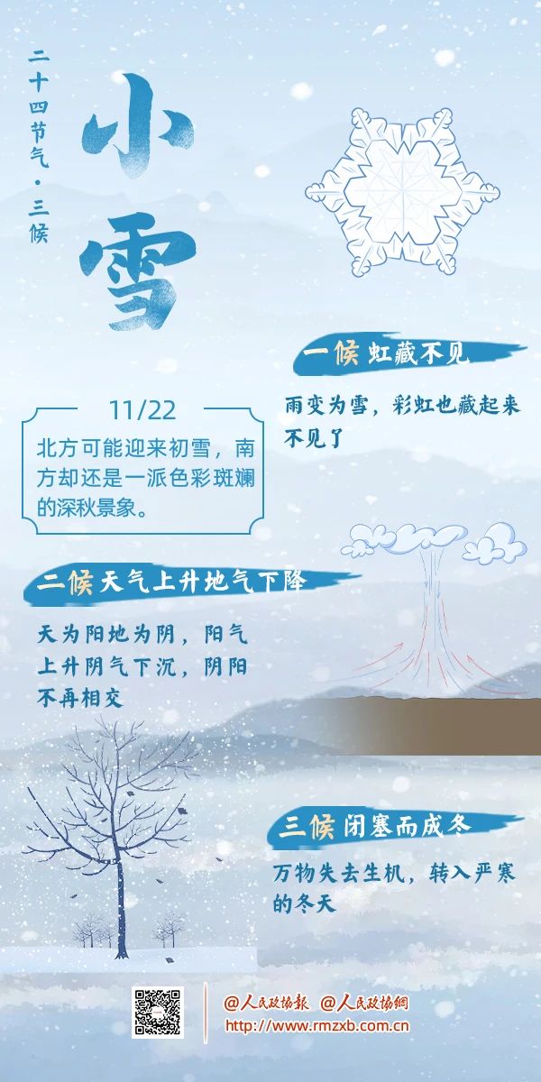 小雪有三候:一候虹藏不见;二候天气上升地气下降;三候闭塞而成冬。此时,雨水因气温降低而凝结成雪,彩虹渐渐隐匿了踪迹??罩械难羝仙?,地面的阴气下降。天地间万物走向沉静,冬日的时间仿佛都慢了下来。