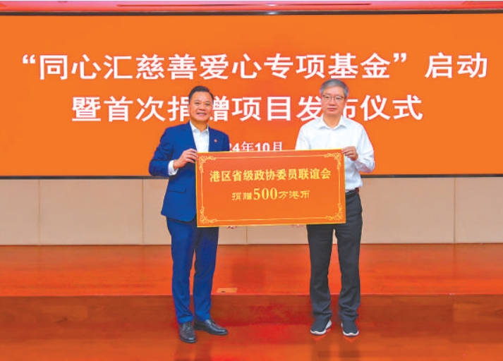 港区省级政协委员联谊会与浙江省政协、浙江省慈善联合总会共同发起设立“同心汇慈善爱心专项基金”,苏清栋(左)出席捐赠仪式。