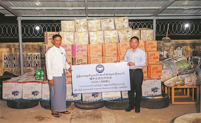 李伯波(右)代表侨团向缅甸救灾安置部捐赠物资,左为该部部长梭温。