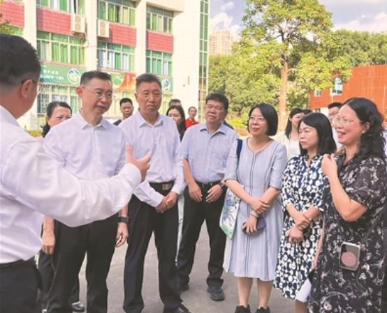 广东省政协“校家社协同育人”专题调研组到茂名市新世纪学校调研,车燕华(右一)做现场介绍。 (图片由受访者提供)