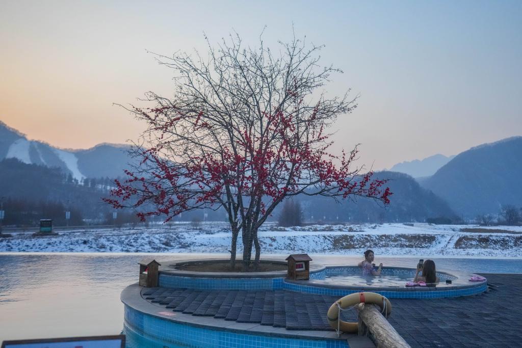 在本溪满族自治县的一家温泉酒店,游客在冰天雪地里泡温泉。新华社记者潘昱龙 摄
