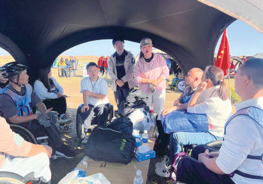 2023年6月27日,银花(右四)在“第二届沙漠轮椅挑战赛”活动现场看望运动员。(图片由受访者提供)