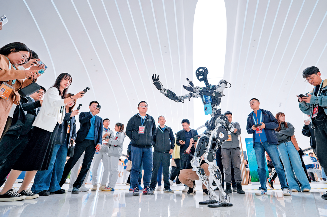 2025年3月27日,在中关村国际创新中心,与会嘉宾和记者在观看一款名为“Adam”的人形机器人表演太极拳。(新华社记者 鞠焕宗/摄)